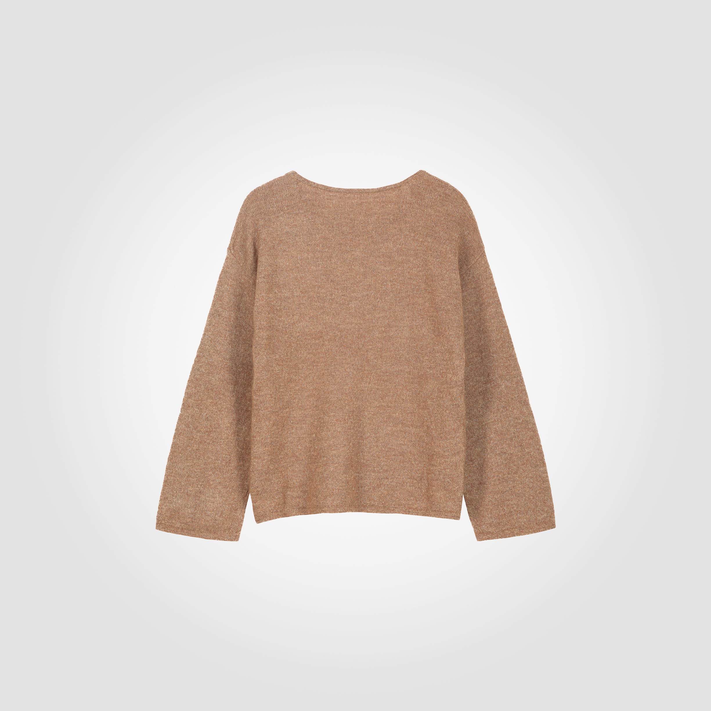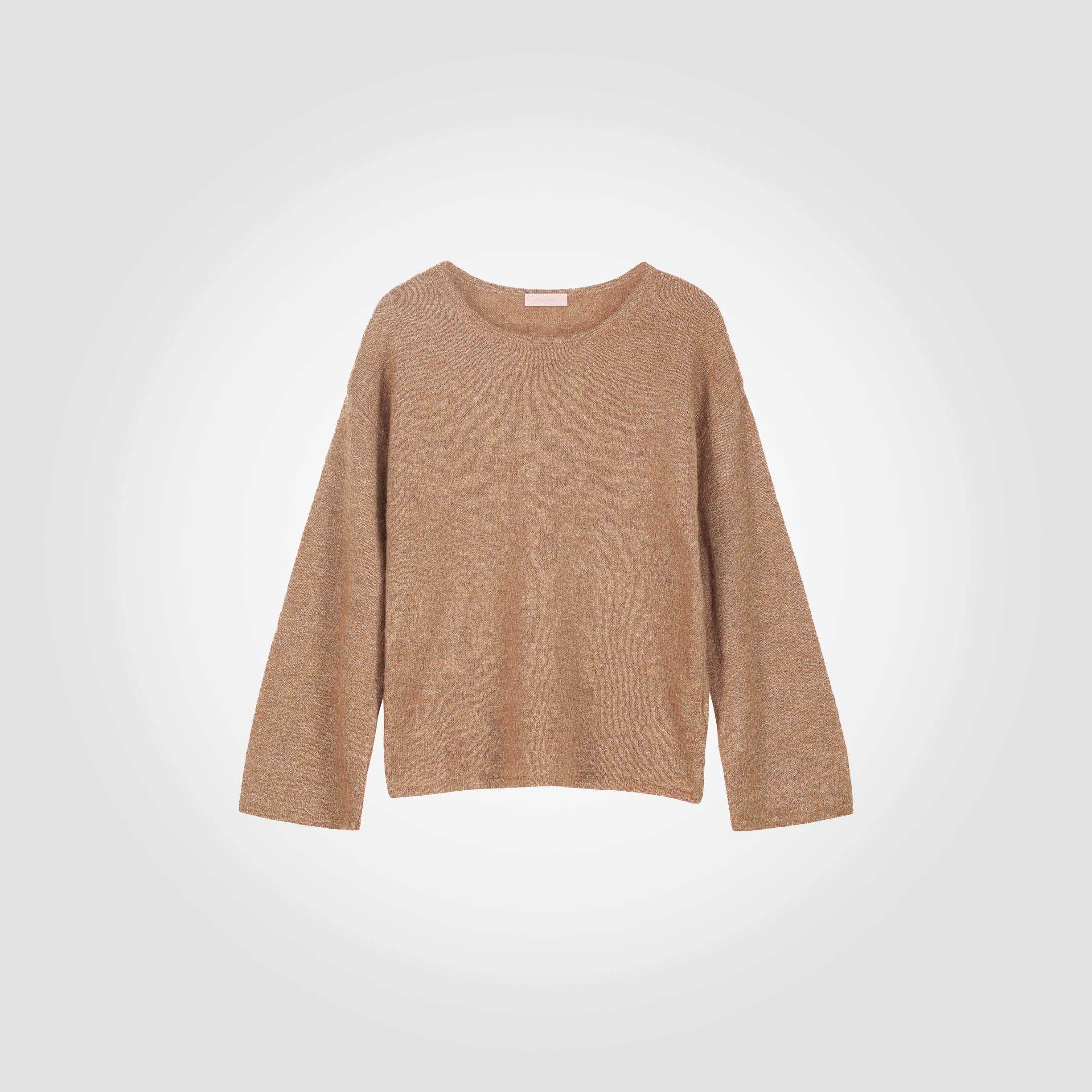 Movimento fluido e contemporaneo con la maglia over . Maniche svasate e collo ampio creano un look femminile e scenografico.